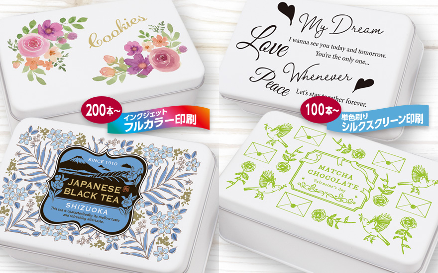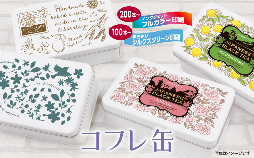 コフレ缶はオリジナル印刷に対応しています。フルカラーの場合は200個から、またはシルクスクリーン(単色刷り)の場合は100個からオリジナル印刷を施すことができます。お客様の独自データ入稿も可能ですが、タマヤでご要望に合わせたデザイン製作も承ります!デザインやデータ作成が必要な場合はお気軽にご相談ください。