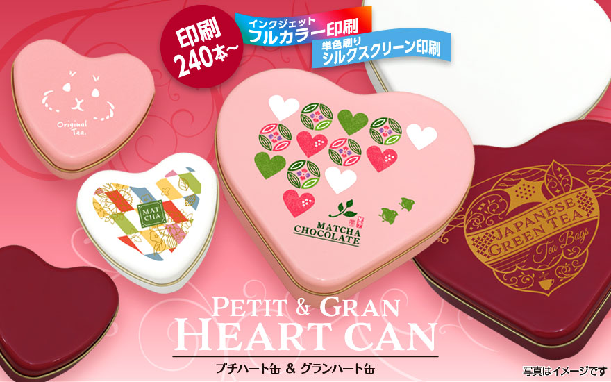 手にスッポリと収まる小さな「プチハート缶」、様々な用途に使える「グランハート缶」。カラーは「ホワイト」、「ミルキーピンク」、「ボルドー」の3色をご用意、100個からご購入できます!