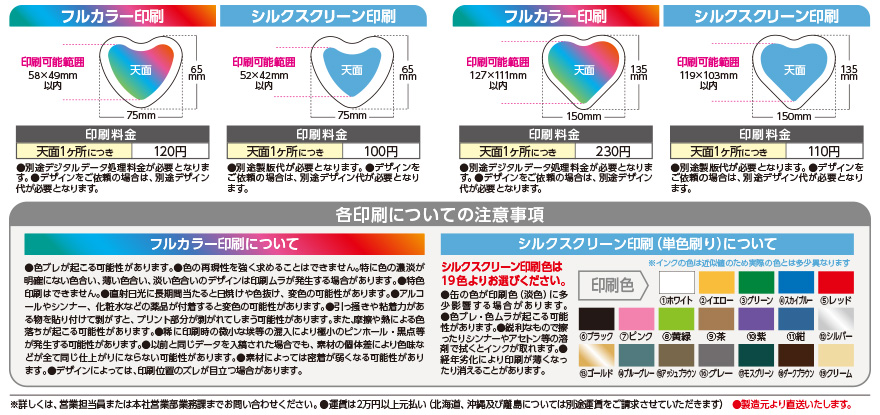 グランハート缶、プチハート缶はオリジナル印刷に対応しています。フルカラー、またはシルクスクリーン(単色刷り)で、オリジナル印刷を施すことができます。データ入稿も可能ですが、デザインからの依頼も承りますので、デザインやデータ作成が必要な場合はお気軽にご相談ください。