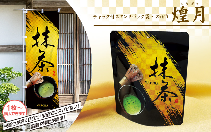 漆黒の間からのぞく市松模様の黄金は、まるで煌めく月を彷彿させる、趣と重厚感のある和のデザインに仕上げました。利便性を考慮した8ミリのフック用穴(ハーフパンチ)付きですので、販促棚やラックに吊り下げてディスプレイすることも可能です。また、煌月は袋と同じデザインが施された「のぼり」もご用意。集客力抜群の店頭ディスプレイとなっています。