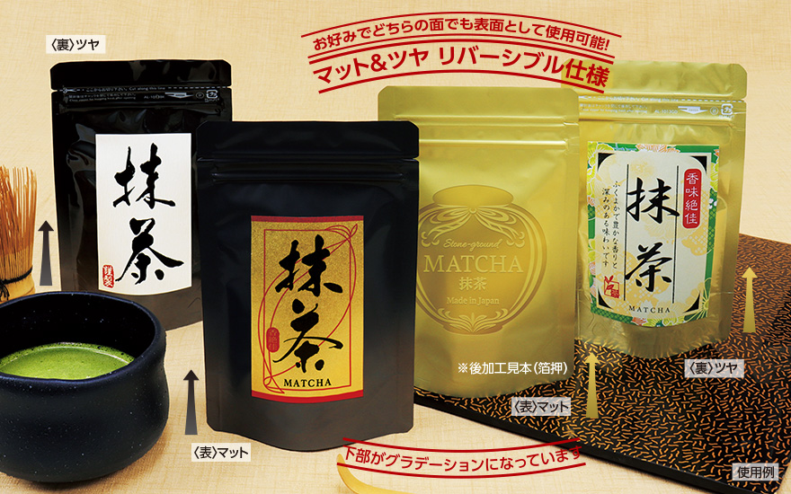 重厚感のある和のデザインが光る「煌月 こうげつ」と、シンプルなグラデーションが施された金と黒のチャック付スタンドパック袋がラインナップ。デリケートな抹茶の品質を保持するため、遮光性に優れたアルミ素材を使用しています。また、抹茶の装いを彩るシールもご用意しております。