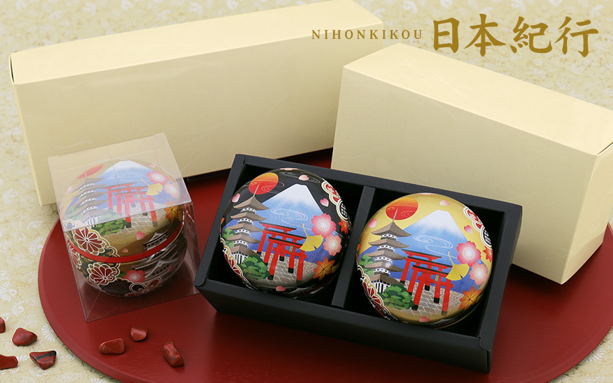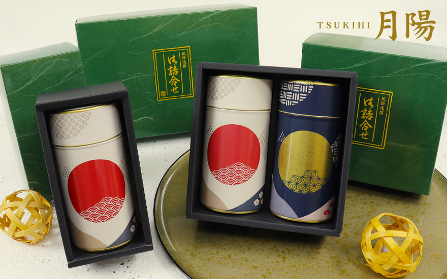 鈴の音をイメージして作られた、丸くて愛くるしいフォルムの鈴子缶「日本紀行(にほんきこう)」と、 昔から愛される被せ蓋タイプの200gの缶「月陽(つきひ)」。和の佇まいの中に斬新さを感じる、贈り物やお土産物としても喜ばれる茶缶です。