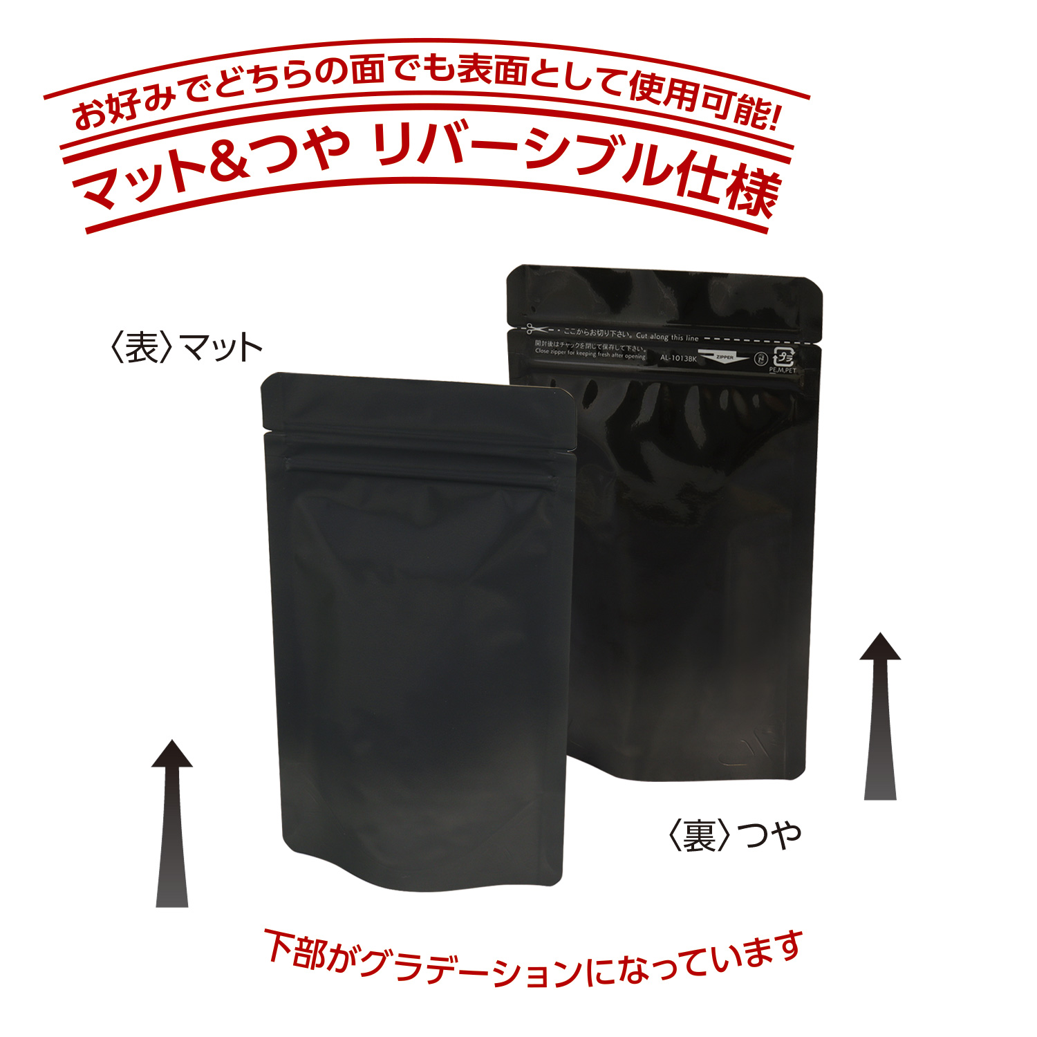 お好みでどちらの面でも表面として使用できる袋です。 「表」はつや消しのマット、「裏」はツヤのある加工を施してあります。